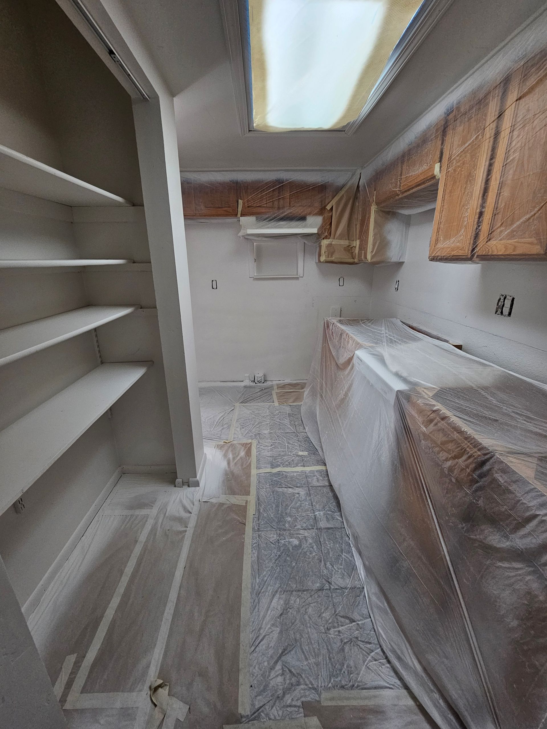 All floors, countertops, and fixtures are covered with drop cloths and plastic sheeting before any painting begins. Tape and masking are applied to edges, hardware, and glass to prevent overspray or drips.